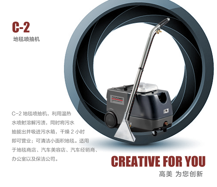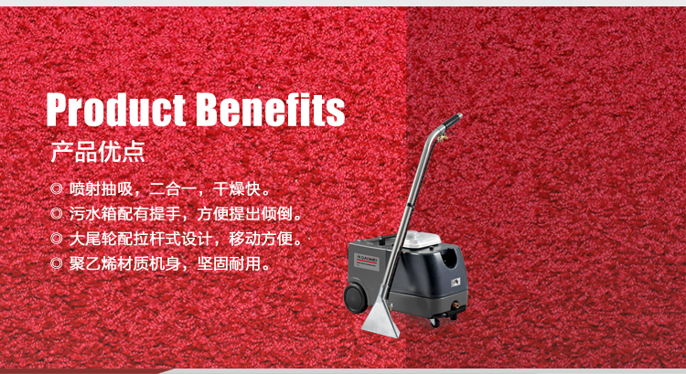 利用温热水喷射溶解污渍,同时将污水抽拔出并吸进污水箱,干燥迅速,2小时即可营业,可清洁小面积地毯。适用于地毯商店、汽车美容、汽车经销商、办公室以及保洁公司。