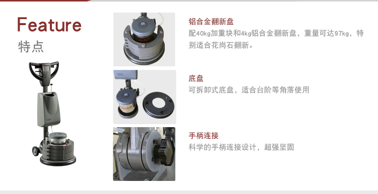 可配40kg加重块和4kg铝合金翻新盘,重量可达97kg,适合石材翻新;也可用于各类硬地面清洗,保养和起蜡等工作。适合工矿、大厦、营业厅,尤其保洁公司用于石材日常护理及特殊处理。