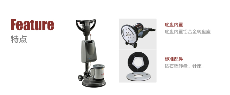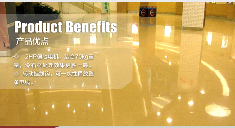 根据力学原理采用偏心电机设计,结合底盘内置铝合金转盘座设计,让操作更轻便;70kg机器净重,2HP电机扭力强大,令石材处理效果更胜一筹;专为石材翻新和晶面处理而设计。适合宾馆、酒店等大面积铺设石材的场所。