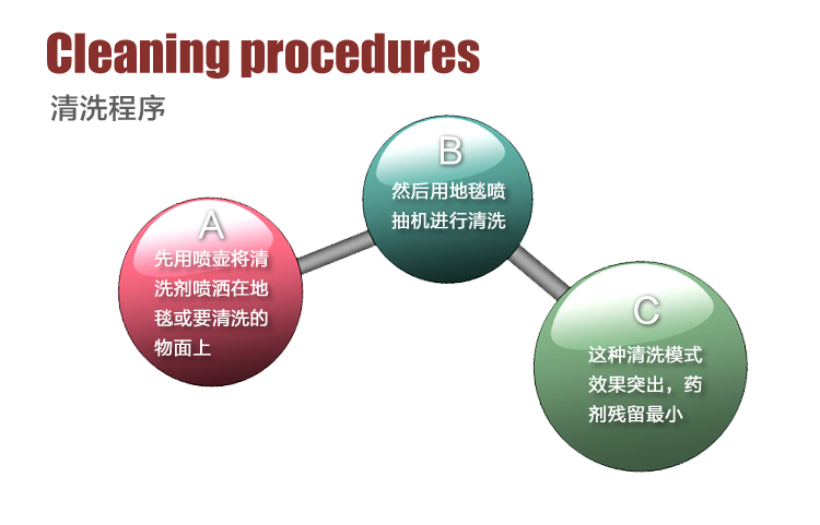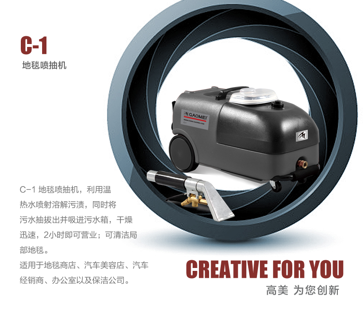 利用温热水喷射溶解污渍,同时将污水抽拔出并吸进污水箱,干燥迅速,2小时即可营业,可清洁局部面积地毯。适用于地毯商店、汽车美容、汽车经销商、办公室以及保洁公司。